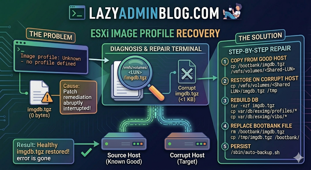 If you see the dreaded “Unknown – no profile defined” error, your host has lost its identity. It no longer knows which VIBs (VMware Installation Bundles) should be installed. This is usually caused by a corrupt imgdb.tgz file.