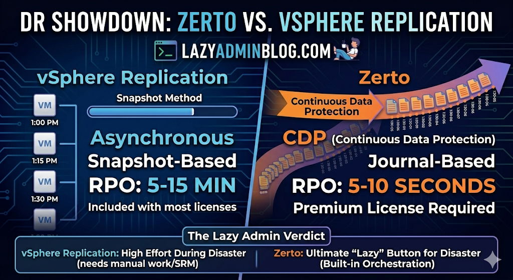 - Zerto is a bit more work to set up but is the ultimate “Lazy Admin” tool during a disasterโyou literally click one button, walk away, and grab a coffee while the entire data center boots itself at the DR site.